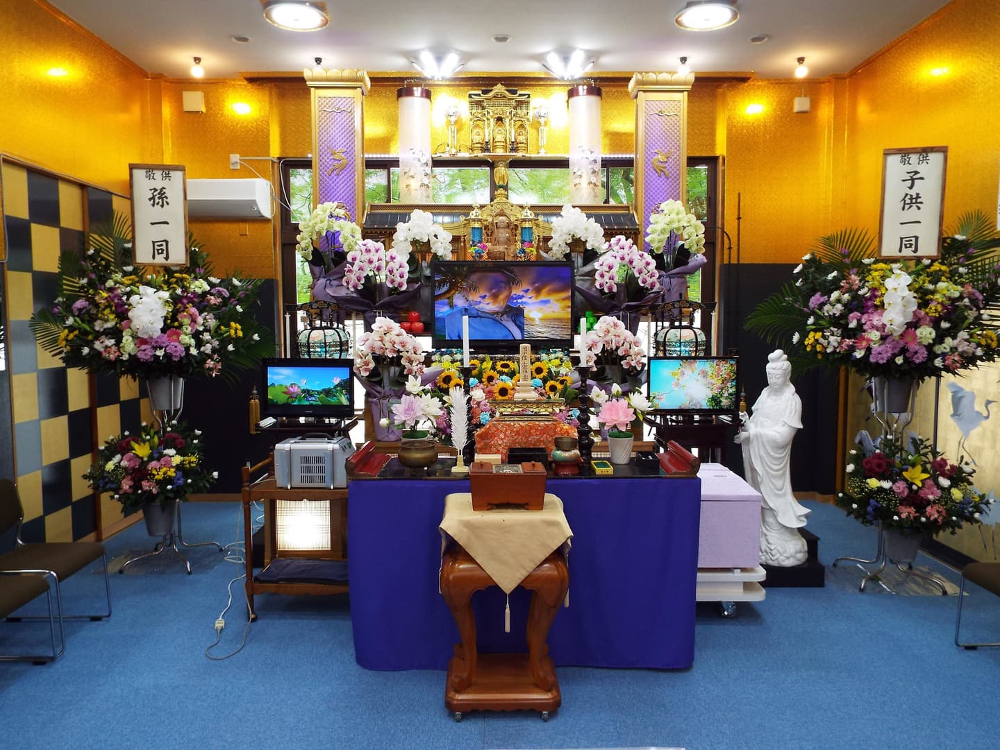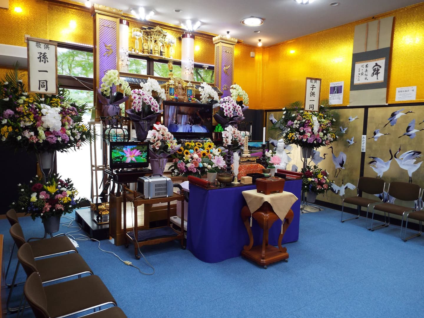 また、見方によっては、豪華ホテルのロビーにいるような雰囲気になるように本堂はシャンデリア電気を使用し、見た目は生花の胡蝶蘭そっくりの(造花)の花をふんだんに使用して豪華絢爛の本堂になるようにしています。