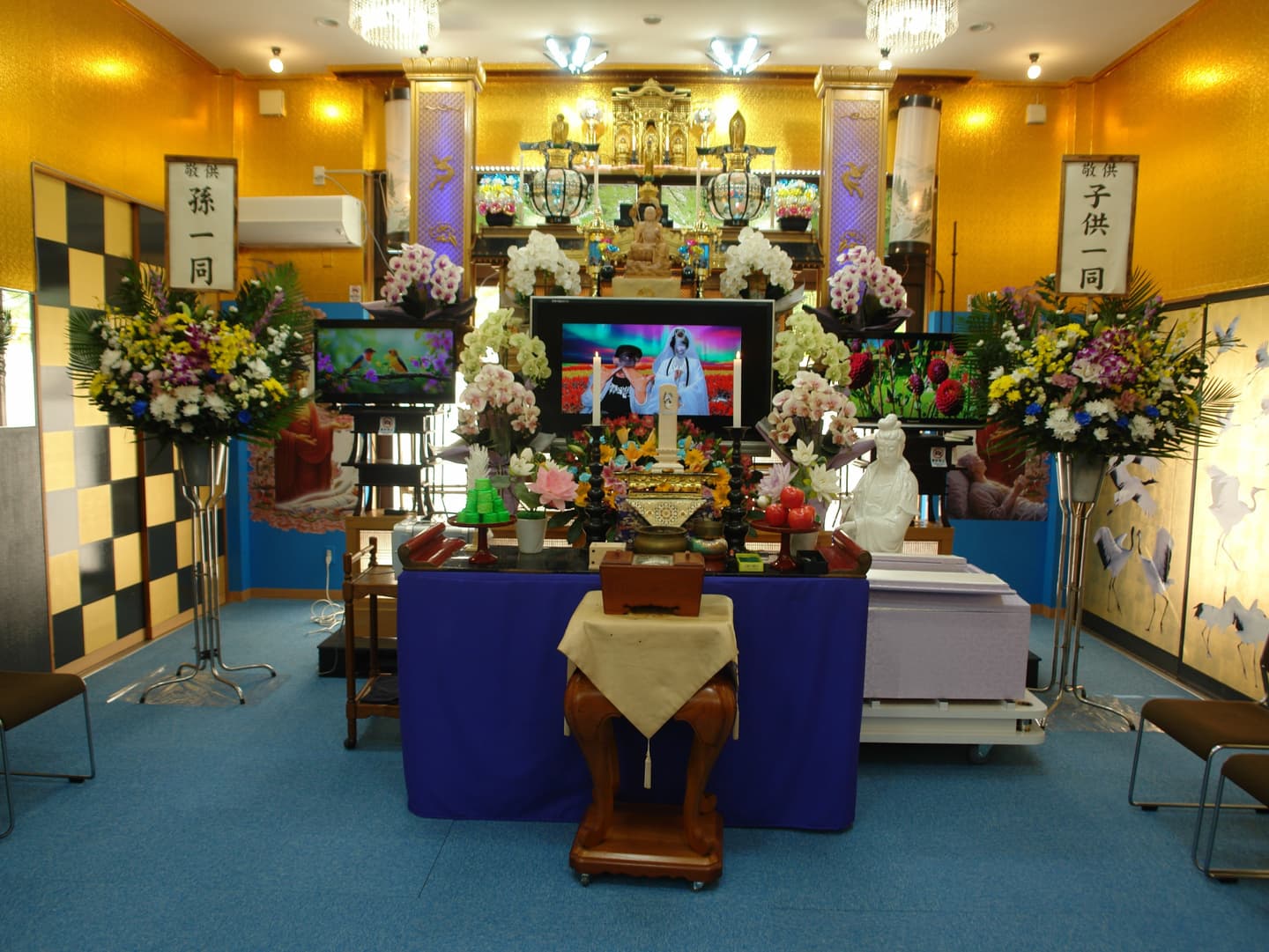 また、見方によっては、豪華ホテルのロビーにいるような雰囲気になるように本堂はシャンデリア電気を使用し、見た目は生花の胡蝶蘭そっくりの(造花)の花をふんだんに使用して豪華絢爛の本堂になるようにしています。
