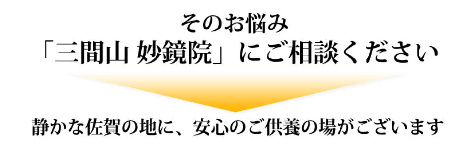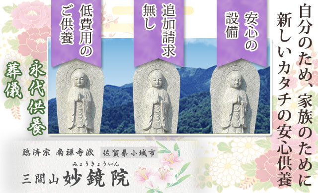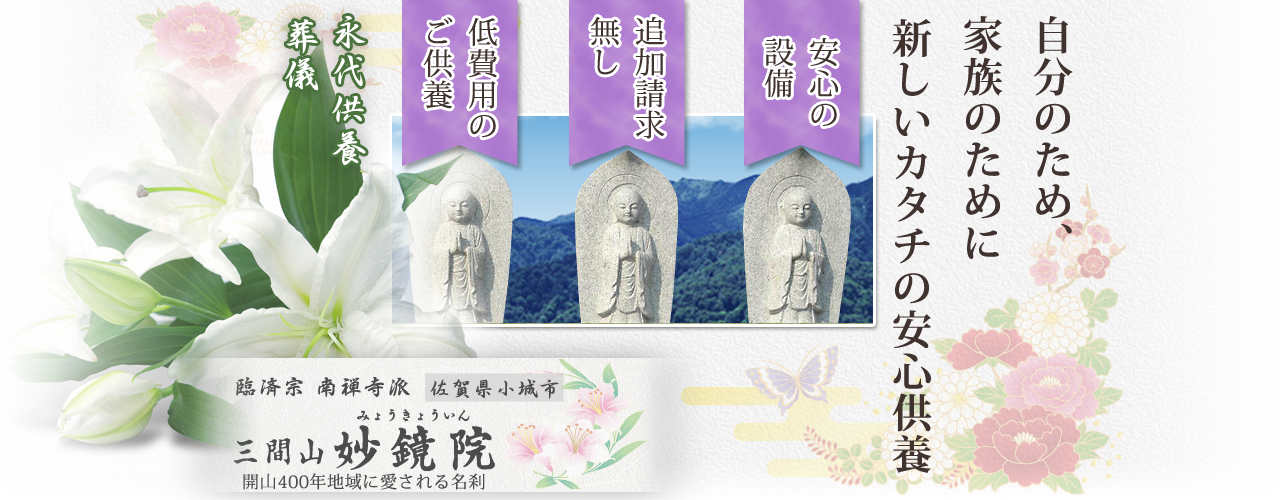 佐賀県小城市小城町の臨済宗(禅宗)・妙鏡院は、故人様の御霊を、心を込めて永代供養・ご葬儀を低費用でさせていただきます。永代供養者・ご葬儀は妙鏡院住職により、妙鏡院本堂にて手厚い法要を執り行います。永代供養依頼者の方で事情があってご参列できない場合も、妙鏡院住職が責任を持って供養し納骨いたします。どうぞ安心してご相談ください。