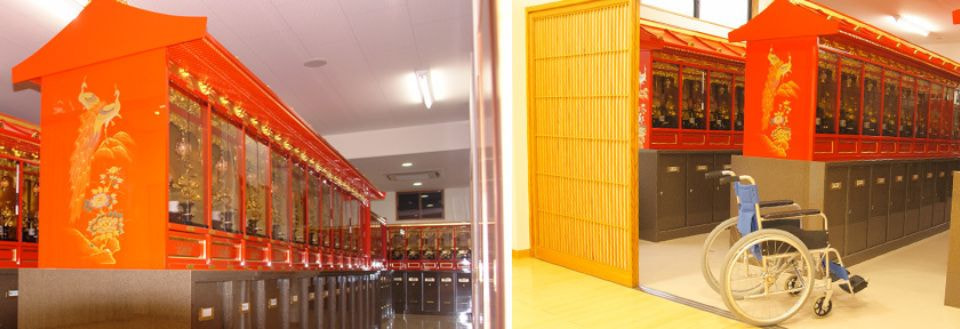 完全バリアフリーですので、車椅子での乗り入れも可能です。本堂も納骨堂も十分なスペースをとって おりますので、車椅子のままでもゆったりとお参りや供養をしていただけます。