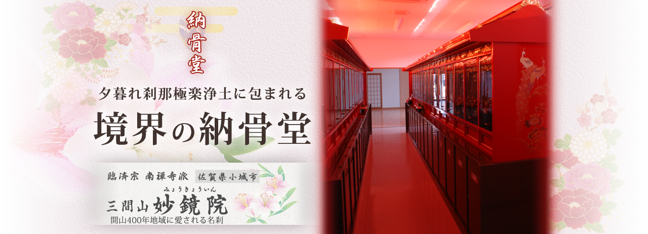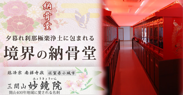 佐賀県小城市小城町の臨済宗(禅宗)・妙鏡院は、故人様の御霊を、心を込めて永代供養・ご葬儀を低費用でさせていただきます。永代供養者・ご葬儀は妙鏡院住職により、妙鏡院本堂にて手厚い法要を執り行います。永代供養依頼者の方で事情があってご参列できない場合も、妙鏡院住職が責任を持って供養し納骨いたします。どうぞ安心してご相談ください。