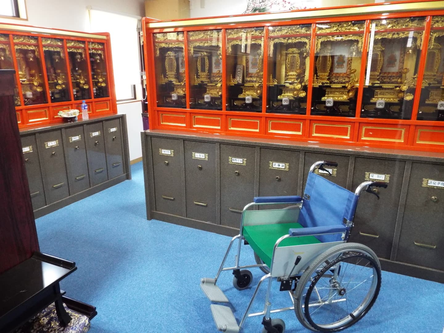 完全バリアフリーですので、もちろん車椅子での乗り入れも可能です。また本堂も納骨堂も十分なスペースをとって おりますので、車椅子のままでもゆったりとお参りや供養をしていただけます。 ※車椅子まで利用しなくても大丈夫な方は歩行車を用意していますのでご利用下さい。