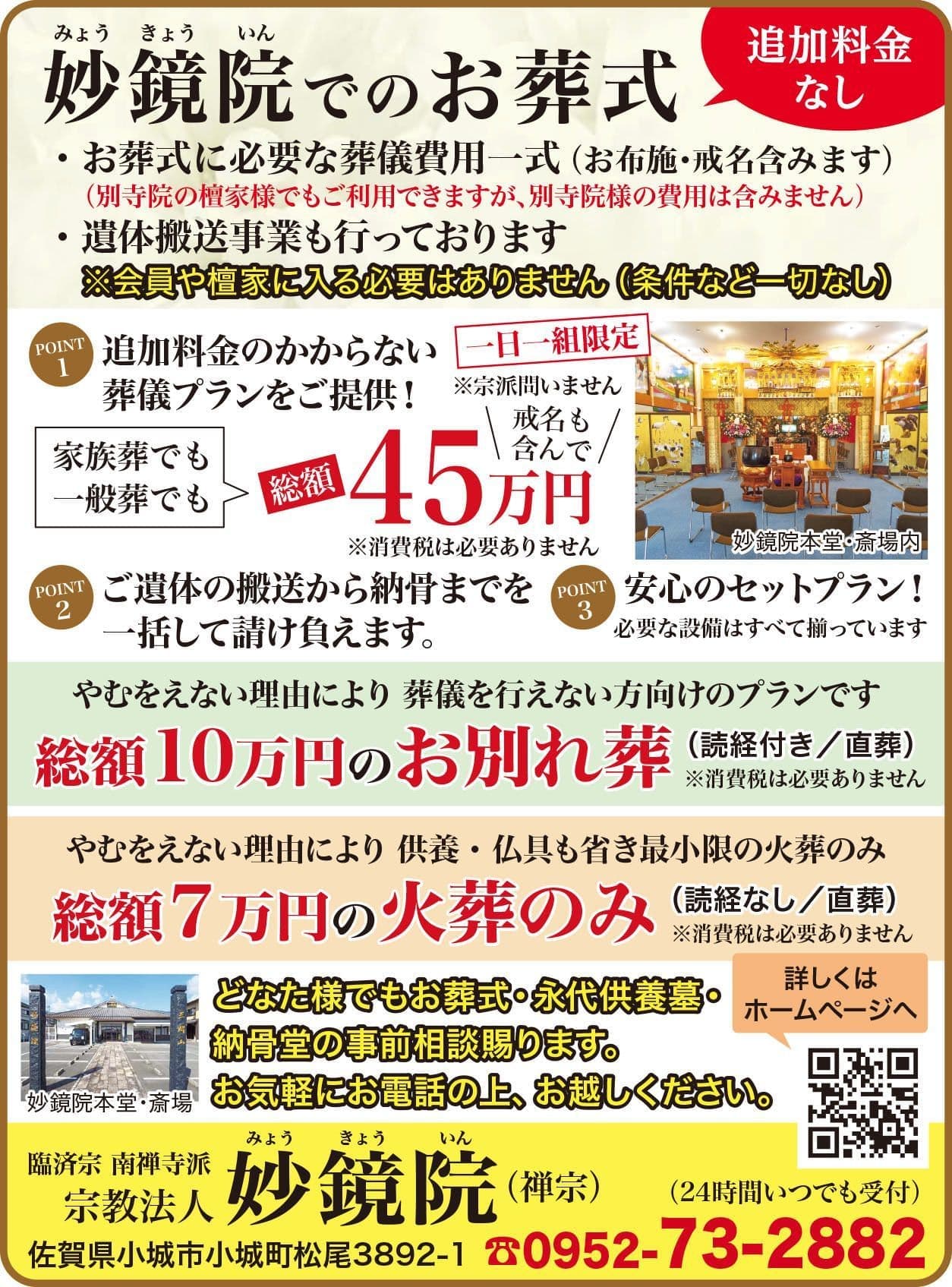 佐賀県内で1番格安のお葬式・永代供養・水子供養・樹木葬・葬儀をお探しの方は日本全国対応の佐賀県小城市小城町の妙鏡院まで