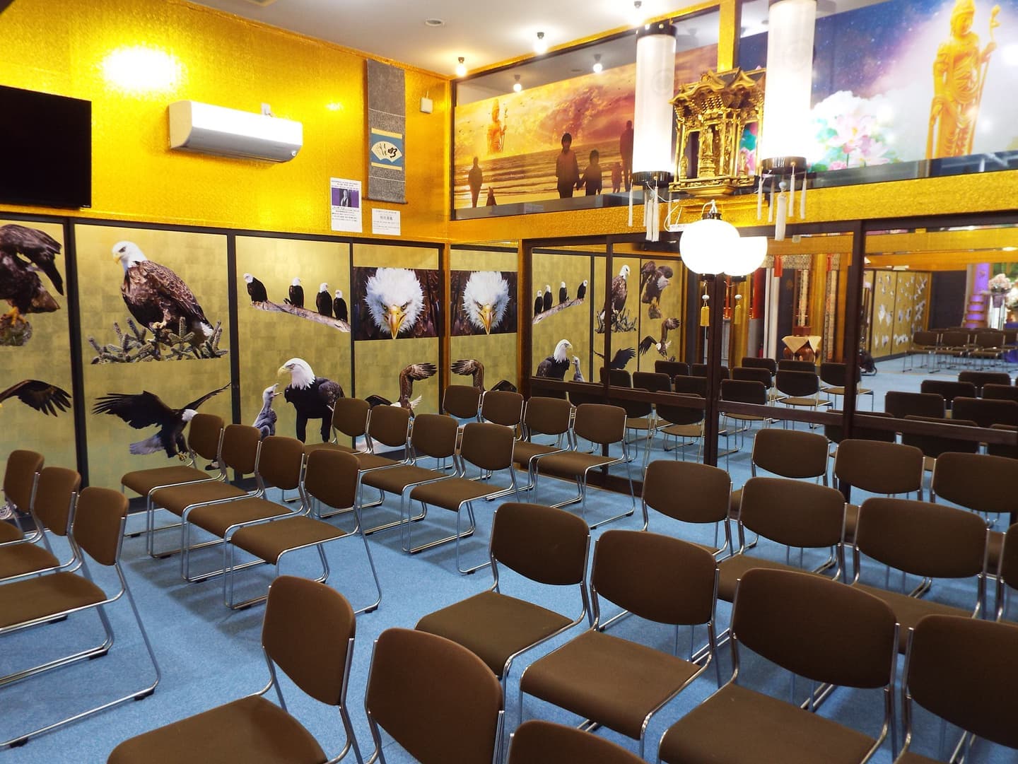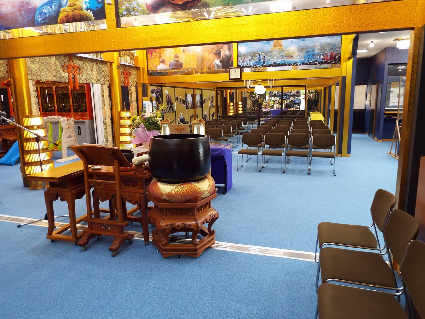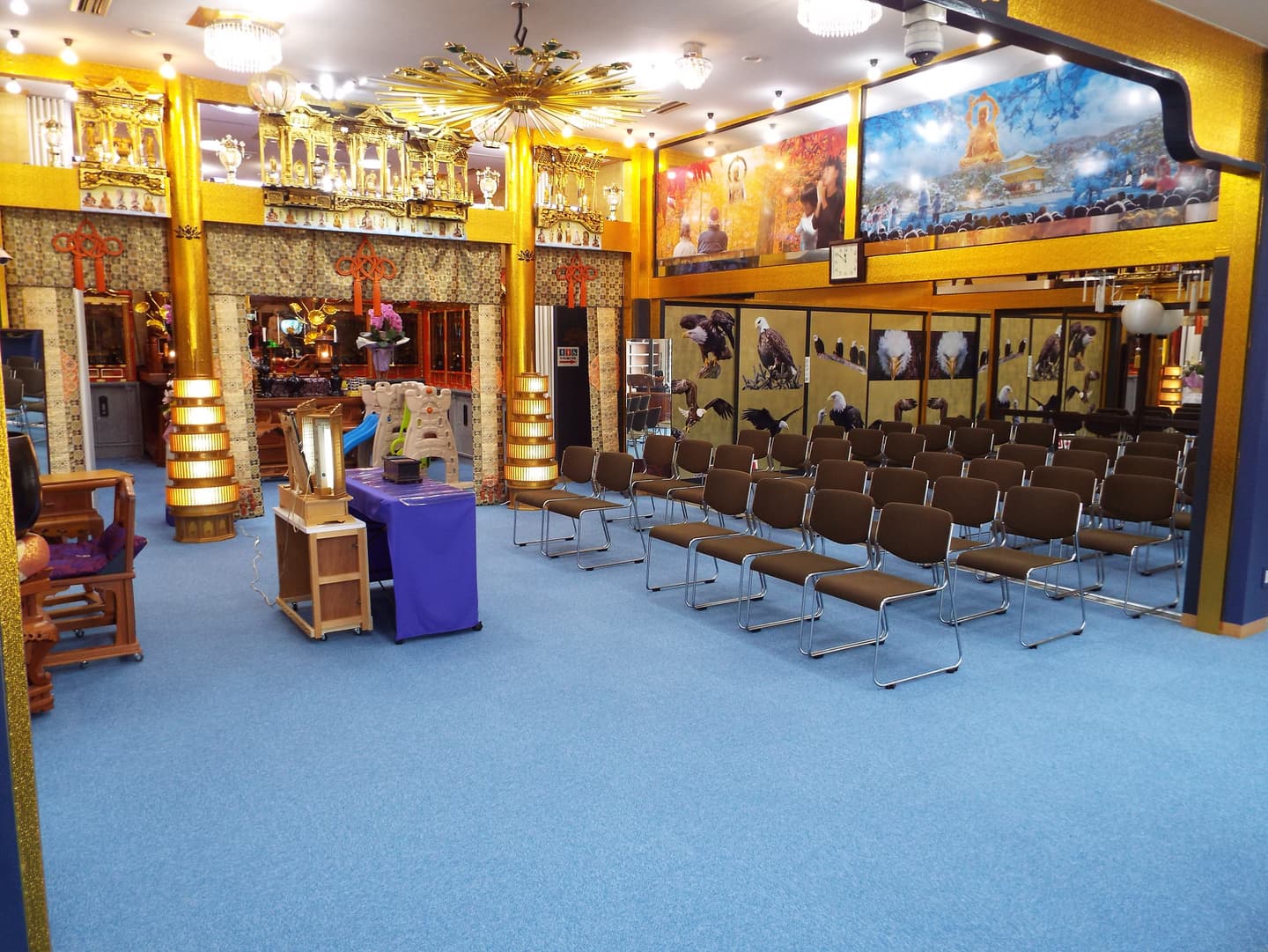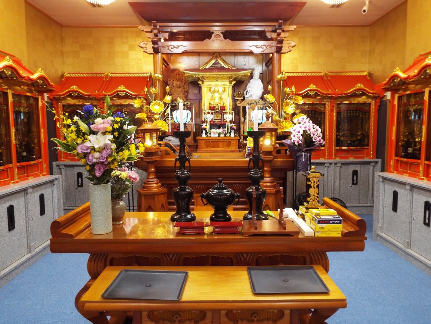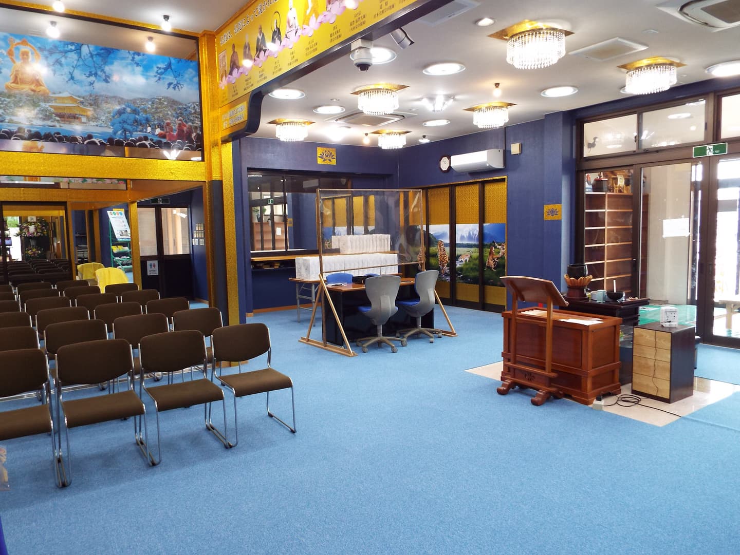 また、見方によっては、豪華ホテルのロビーにいるような雰囲気になるように本堂はシャンデリア電気を使用し、見た目は生花の胡蝶蘭そっくりの(造花)の花をふんだんに使用して豪華絢爛の本堂になるようにしています。