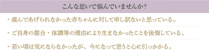 いつまでも想い、悲しみ途方に暮れるばかりでは、水子様も成仏出来ません。 また、気がかりな存在を放置したままで は、自らも幸せは手にできません。本当に水子様の事を想い、幸せになってほしいという気持ちがあれば、自らが幸せ に生活し、ゆとりある慈しみの心で供養することが大切です。