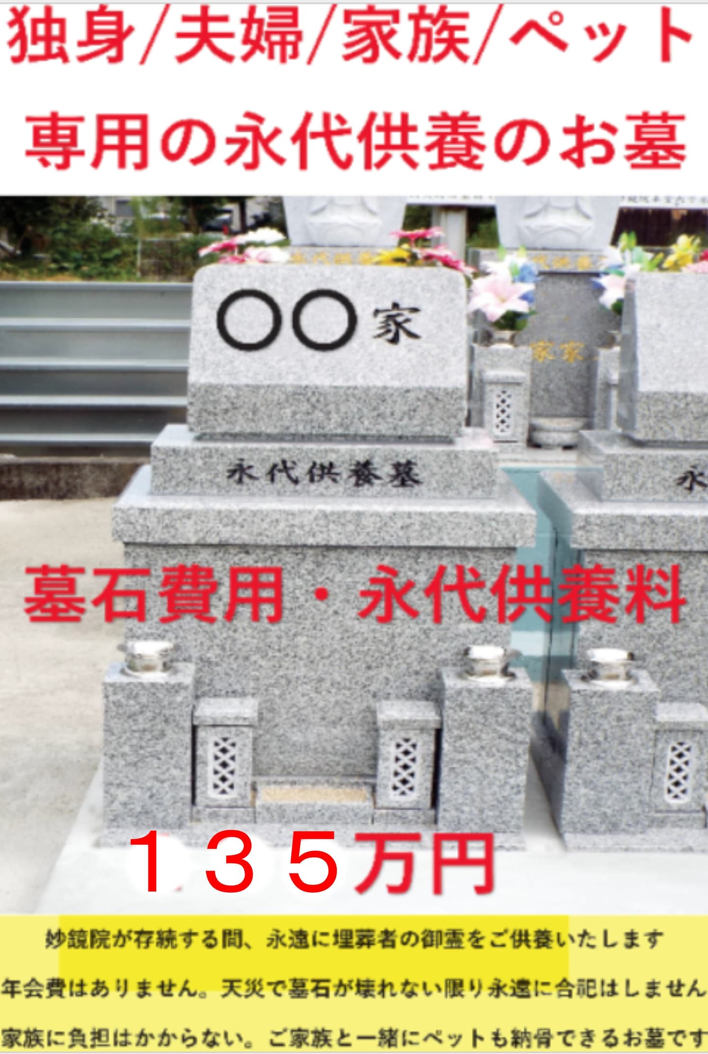 ※下記、135万円は1墓石あたりの金額です。1霊ごとにかかるものではありません。先祖代々と一緒にペットも納骨埋葬が可能です。